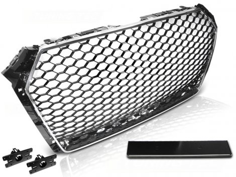Решетка RS style Audi A4 B9 в хроме, не требует покраски. Решетка радиатора РС Ауди А4 Б9 готова к установке, укомплектована рамкой под значок AUDI, рамкой под гос номер. Радиаторная решетка подходит на Audi A4 B9, Audi S4 B9 2015-2019 SEDAN / KOMBI. Решетка радиатора Ауди А4 Б9 RS подходит на обычный бампер и бампер S-line. Решетка в бампер Audi A4 B9 не подходит на Audi RS4 и Audi ALLROAD. Возможно подключение штатного парктроника, в комплекте кронштейны для датчиков.